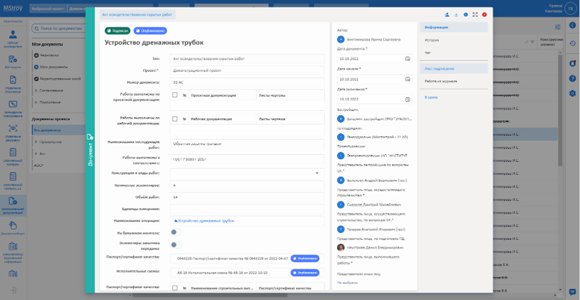 Контроль подписания ИД всеми уполномоченными представителями ЭЦП и участниками строительства; Контроль версий с учетом ранее полученных замечаний; Сокращение количества ошибок, связанных с человеческим фактором.